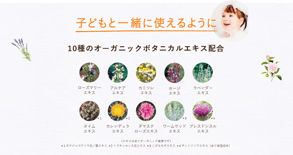 10種のオーガニックボタニカルエキス配合で優しさにこだわり、
